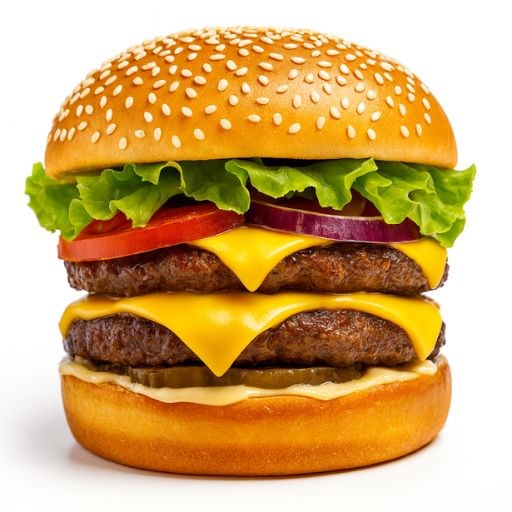 Булочка,две котлеты говяжьи, огурцы маринованные, сыр плавленный, лист салата, лук красный репчатый, соус, помидор