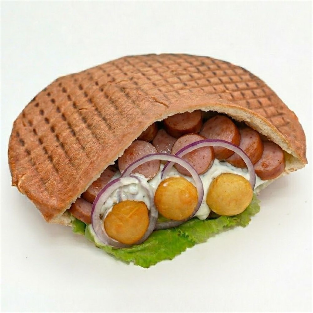 Лепешка, капуста пекинская, помидор, огурцы маринованные, сосиски, соус чесночный, кетчуп, соус горчичный, лук красный репчатый, зелень, лист салата, картофельные шарики