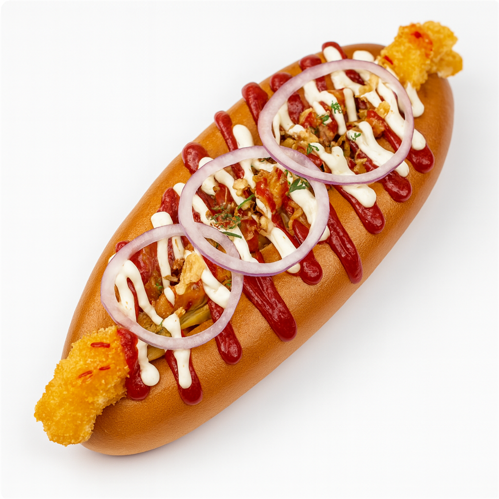 Булочка для хот-дога, креветка, помидор, огурцы, кетчуп, соус свит чили, зелень, луковые кольца, лук красный репчатый