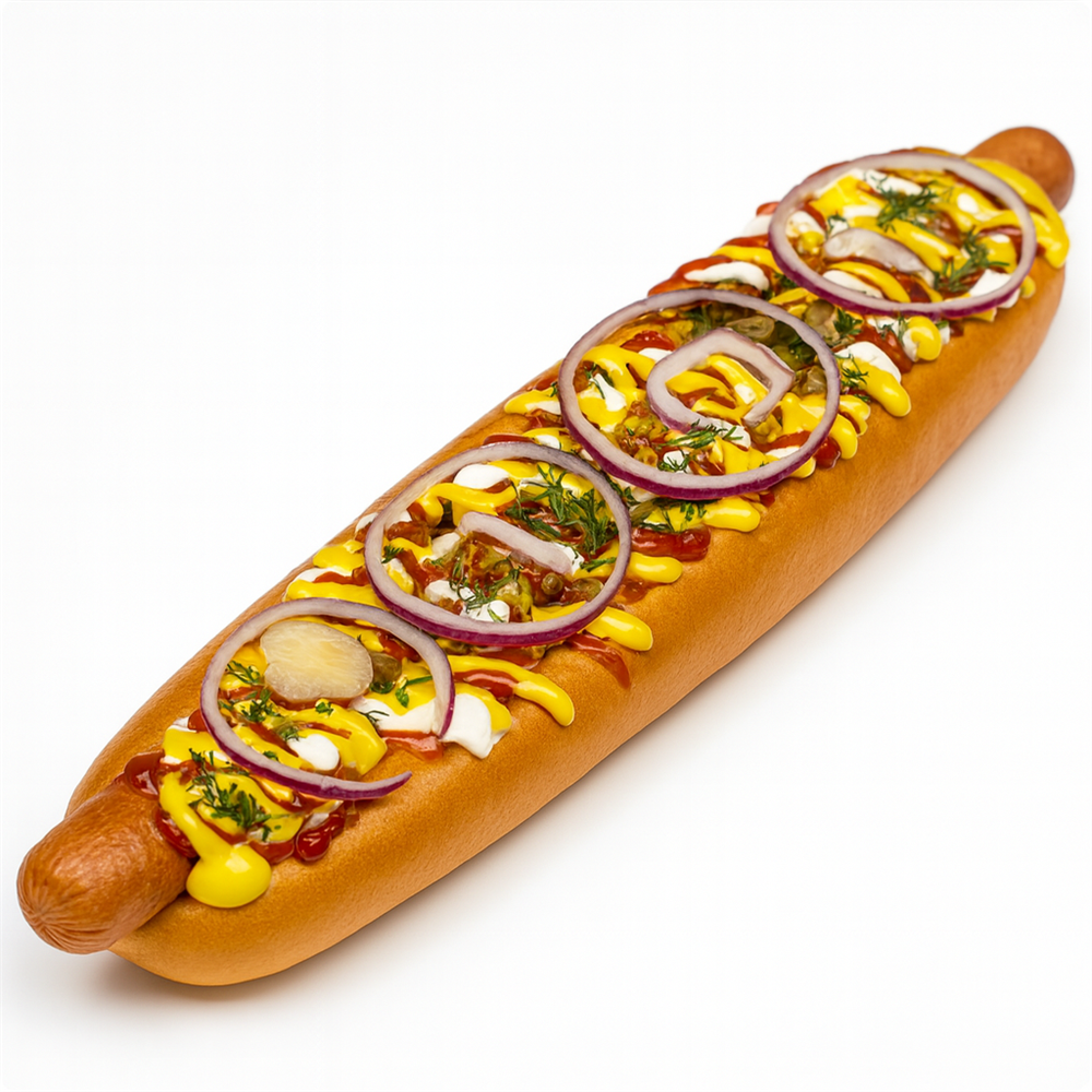 Булочка для хот-дога, сосиска, помидор, огурец, соус чесночный, кетчуп, соус горчичный, зелень, луковые кольца, лук красный репчатый