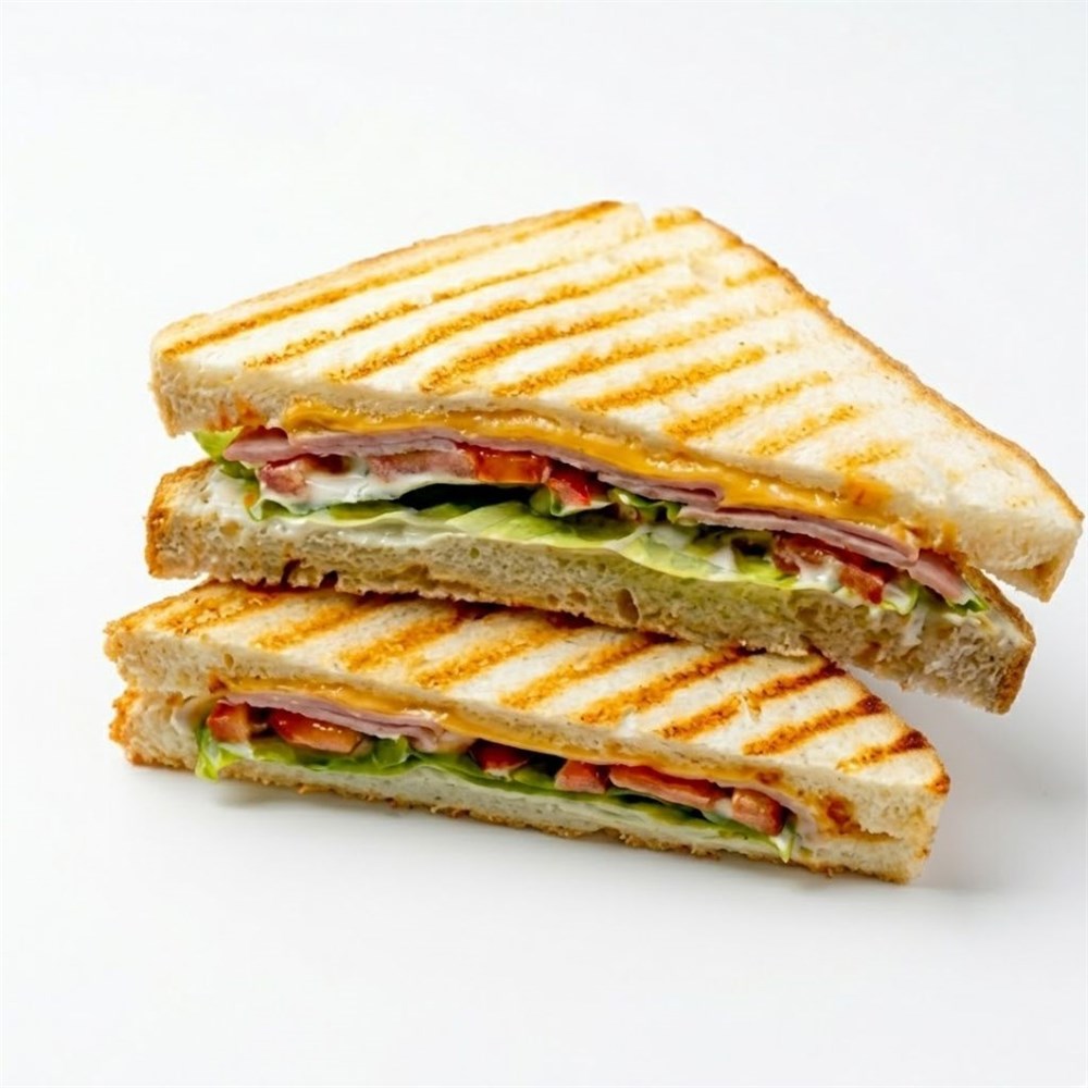 Хлеб тостовый, ветчина, кетчуп, соус чесночный фирменный, лист салата, сыр плавленый, помидор