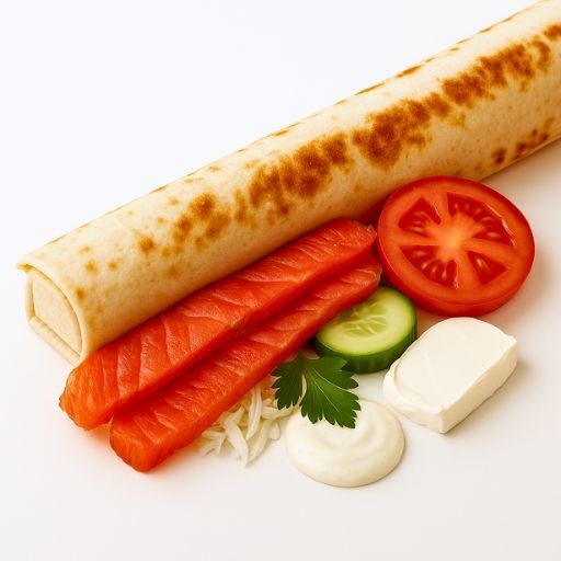 Лаваш, нерка х/к, капуста пекинская, помидор, огурец, соус чесночный, зелень, сыр сливочный