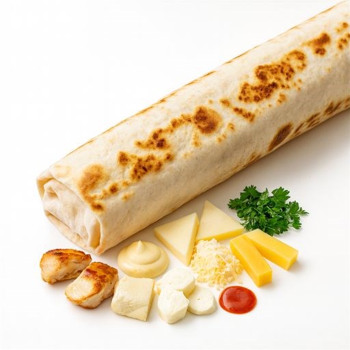 Лаваш, капуста пекинская, филе куриное с бедра, помидор, огурец, соус сырный, сыр моцарелла, сыр сливочный, сыр пармезан, сыр чеддер, зелень