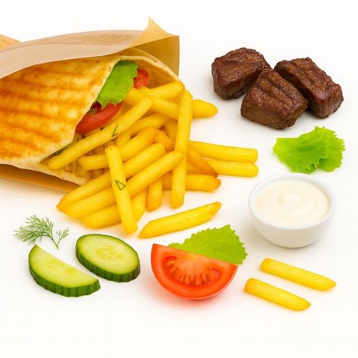 Капуста пекинская, помидор, огурец, говядина, соус чесночный, соус барбекю, зелень, лист салата, картофель фри