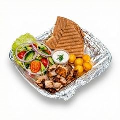 Лепешка, капуста пекинская, помидор, огурцы, филе куриное с бедра, соус чесночный, лук красный репчатый, зелень, лист салата, картофельные шарики