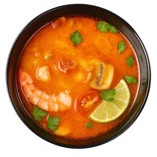 Том ям соус, соус рыбный, куриный бульон, аджиномото, сахар песок, соль, лайм, лемонграсс, паприка, креветка тигровая, кальмар, шампиньоны, помидор черри, кинза, сливки 22%